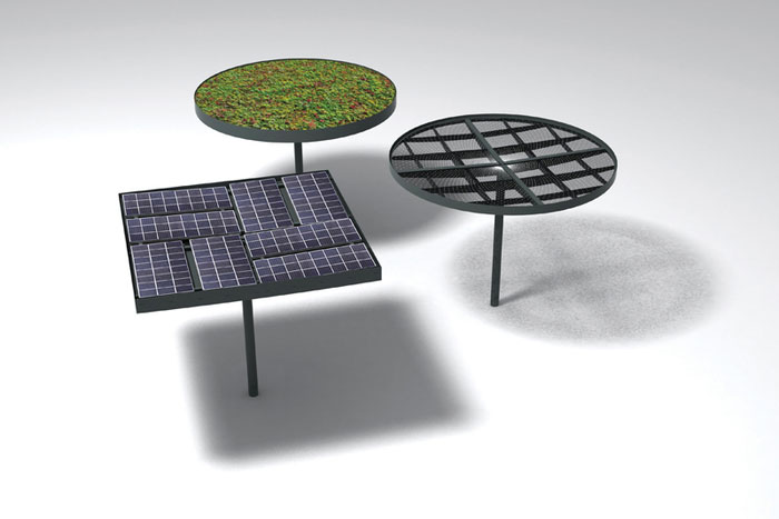 Konstruktionen består af galvaniseret stål, der kan pulverlakeres i valgfri farve med dræn igennem benene. LED lys kan integreres i glastaget, som desuden kan erstattes af et sedumtag eller forsynes med solceller.