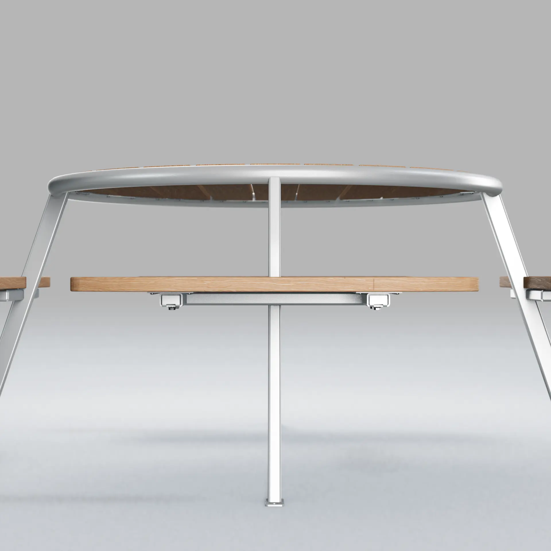 PONGO bord/bænksæt Cirkel skaber generøse rum til socialt samvær med plads til op til 8 personer. For yderligere at fremme tilgængelighed og inklusion fås møblerne i en tilpasset version med integreret kørestolsplads, der giver plads til 7 personer i alt.
