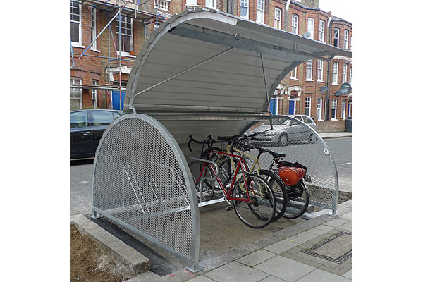 Denne prisvindende cykelhangar er udført i galvaniseret stål med sider af kraftigt trådnet. Lågen holdes åben i den ønskede højde af en gasfjeder.